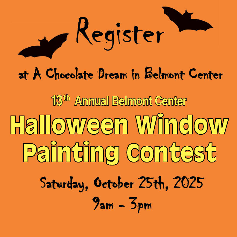 Young painters (age 6+) can register to participate in the annual Halloween Window Painting Contest on Saturday, October 25th from 9am - 3pm. Sponsored by the Belmont Center Business Association, please register at A Chocolate Dream on Leonard Street. $15 per painter.